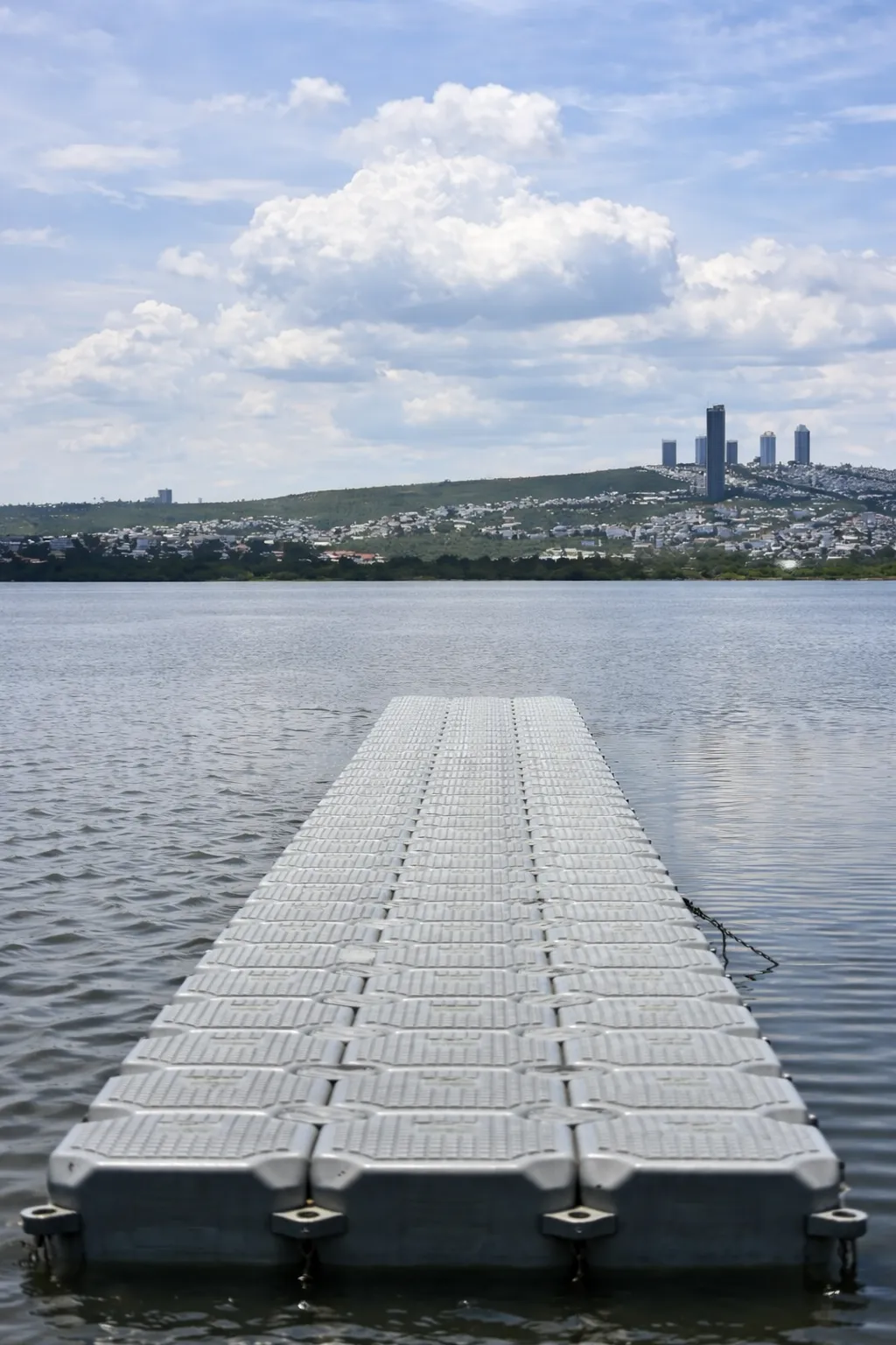 Muelle flotante modular lineal, diseñado como sendero ecológico para accesos en zonas naturales, con bajo impacto ambiental, superficie segura y alta durabilidad.
