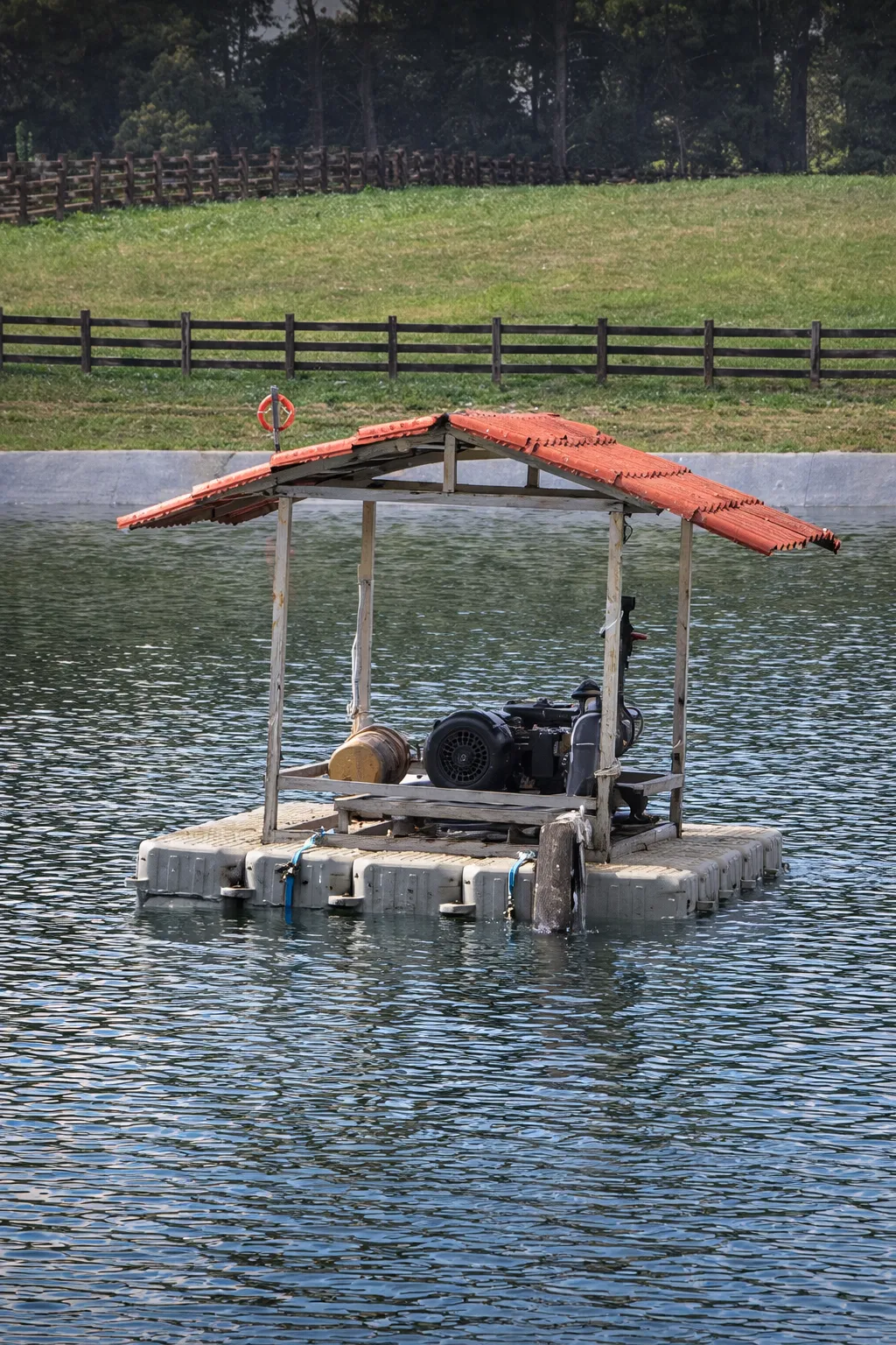 Plataforma flotante modular en forma de U, diseñada para sistemas de bombeo y equipos técnicos, ofreciendo acceso seguro, estabilidad y facilidad de mantenimiento en entornos industriales o hidráulicos.